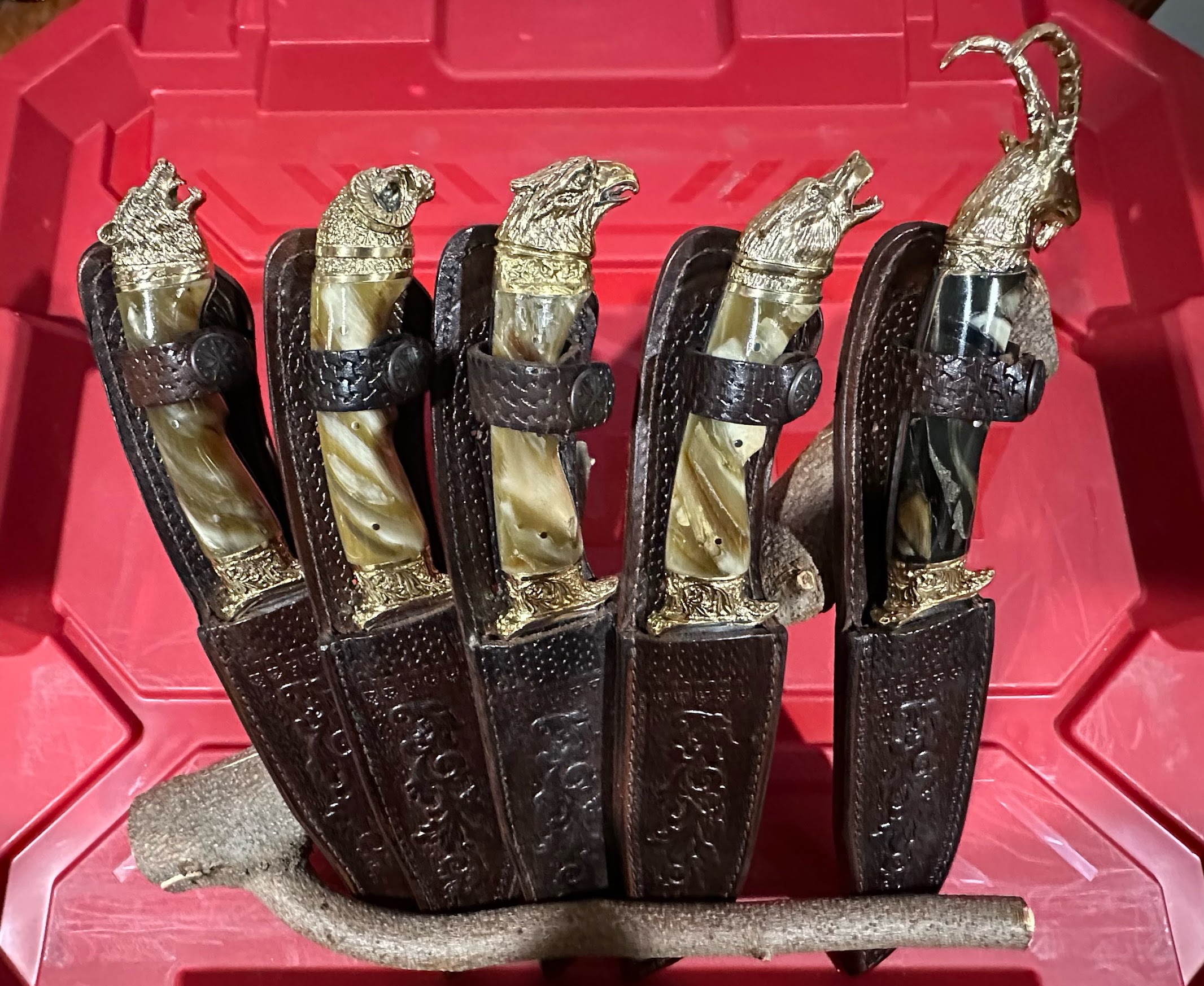The Cretan Trophy Handmade Knife is a unique and authentic piece crafted by the brand Treasures of Crete in Greece. With a stainless steel blade over 5 inches in length and a clip point blade design, this knife is both functional and stylish. The ambidextrous design and full tang construction ensure durability and precision. The handle is made of keratin, complementing the overall aesthetic of the knife. This original handmade piece also includes a sheath for easy storage and transport, making it a must-have for collectors of custom and unique knives. Each of these handcrafted treasures is an impressive 6mm thick. The Stainless Steel blade is made from MOV6-C60 Steel and is Rockwell 60 hardness. The keratin handles are buttressed by hand cast brass pommel and bolster. Because they are handmade, no two knives are the same.