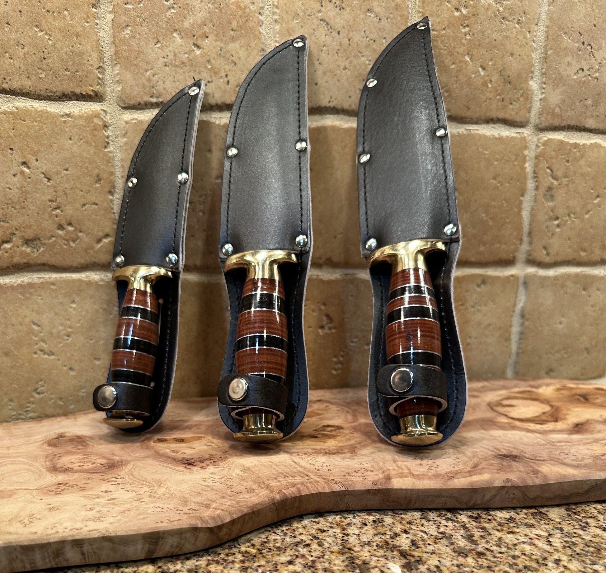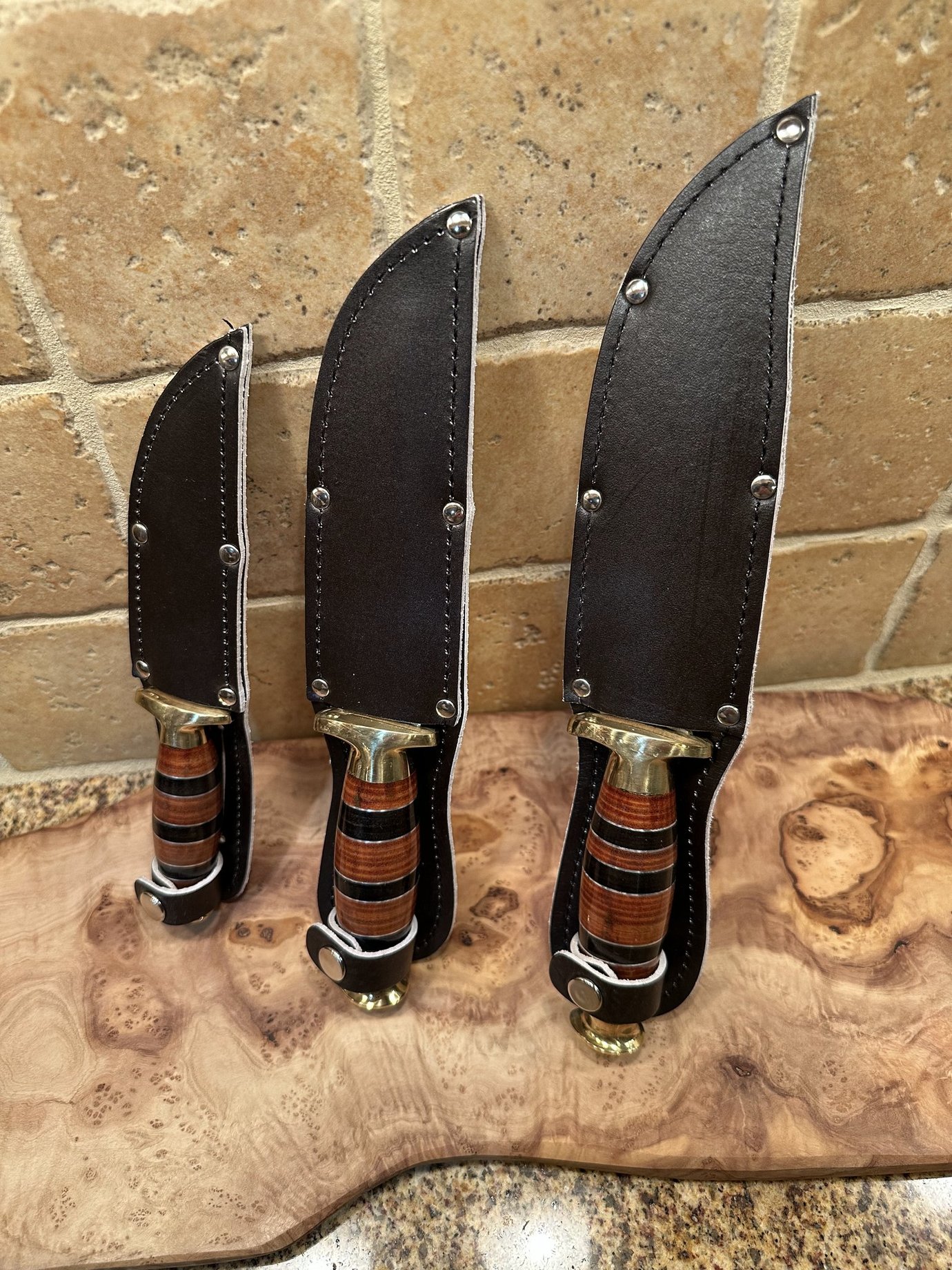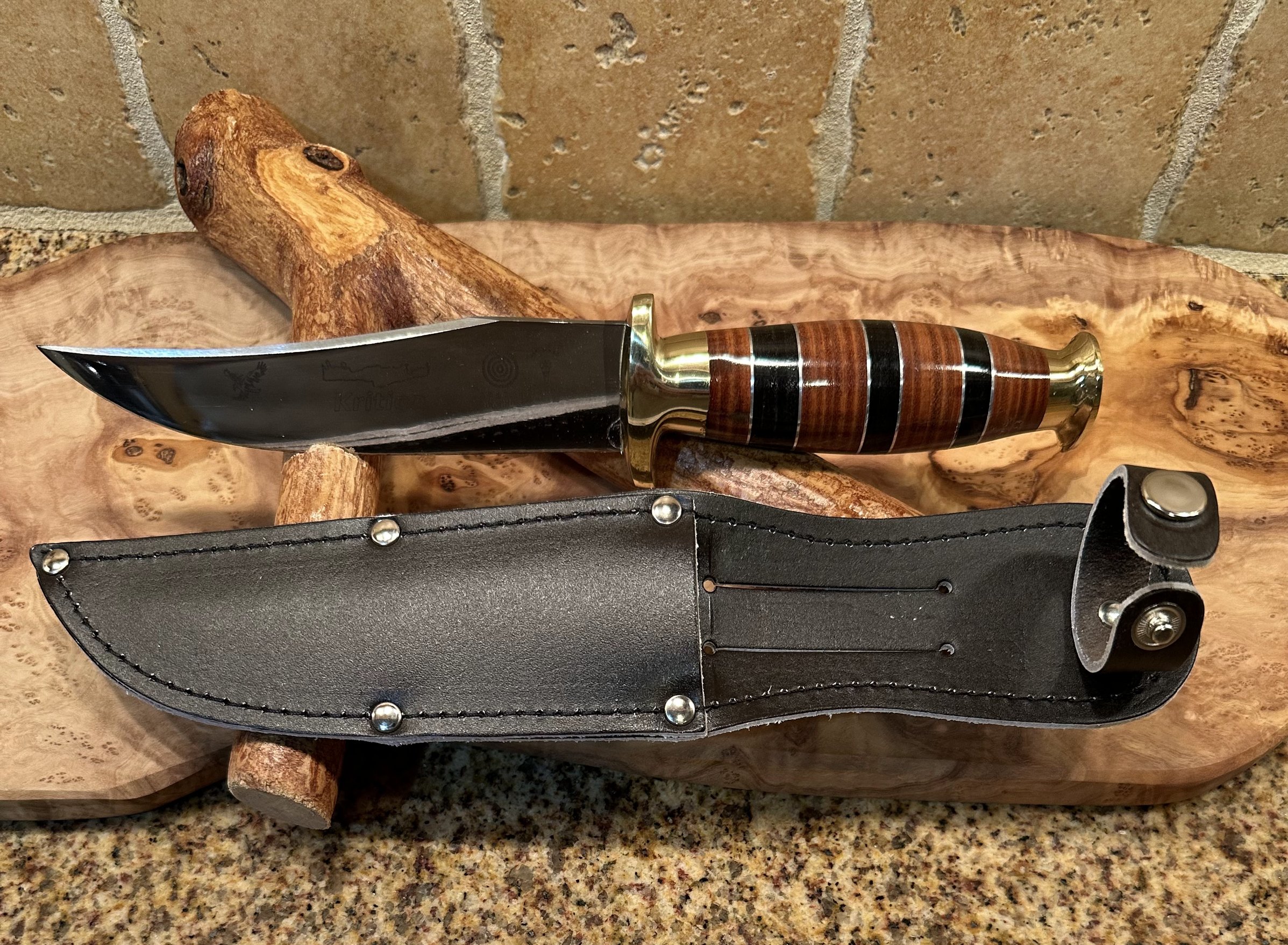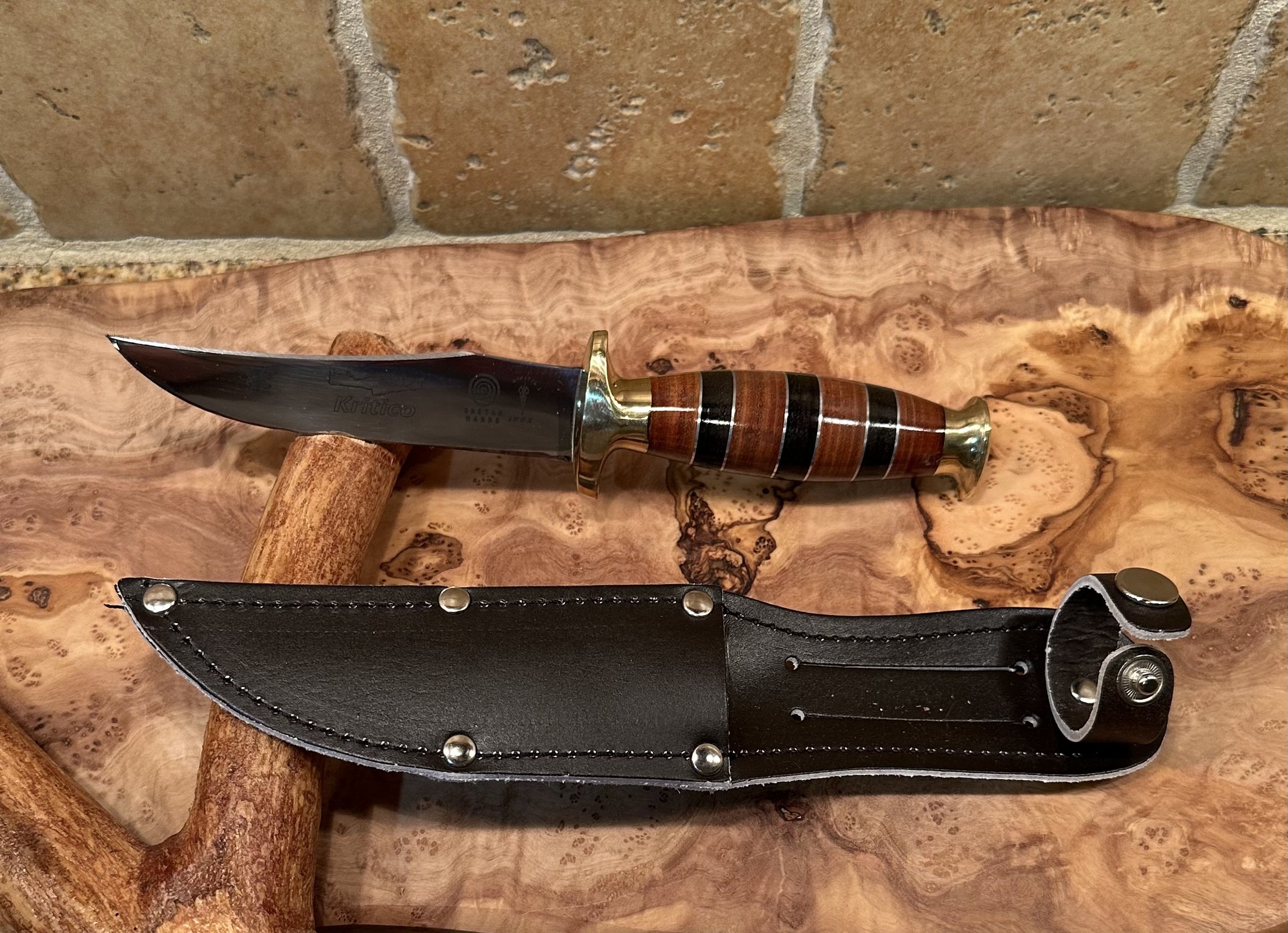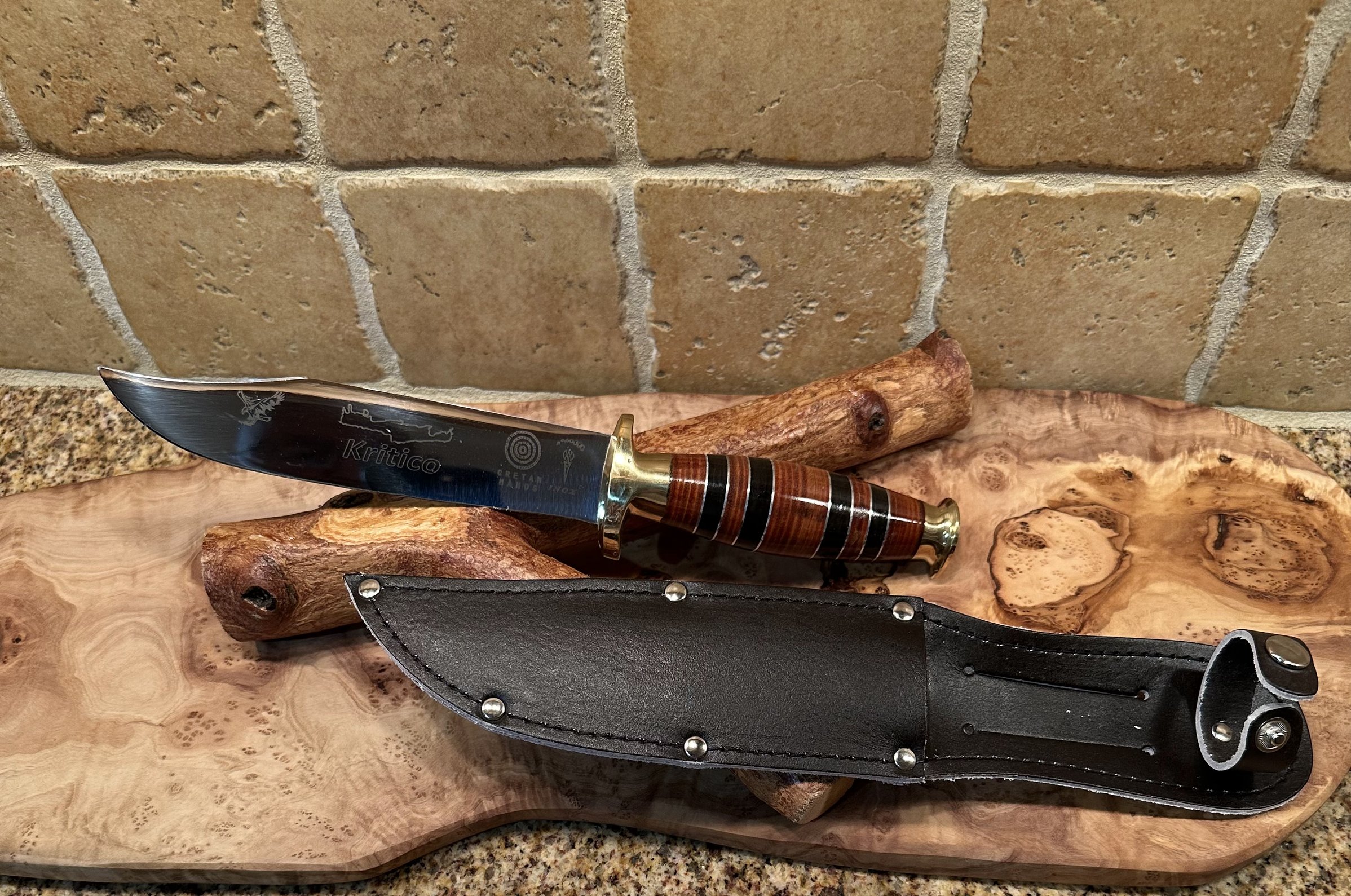 Here is a traditional dagger design built with the Cretan emphasis of blade inscription. The full grip handle is lathed and polished leather. Offered in three sizes, the mov6-c60 stainless steel blade has a beautiful laser etching and comes complete with a leather sheath.